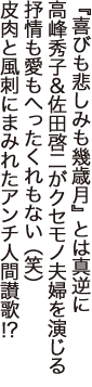 小さな家一軒のセットと、たった20日間で撮り上げたピリ辛コメディ。欲にまみれたみみっちい小市民ばかりが登場し、その言動をコミカルに、そしてテンポよく赤裸々に追っていくことで、人間の不思議な可笑しみまで見事に描出されていく。前作『喜びも悲しみも幾歳月』まで笑いのネタにする徹底ぶりで、そこで日本の麗しき模範夫婦を体現した高峰秀子と佐田啓二に真逆のダメ夫婦を演じさせているのも楽しいが、これは「役者はイメージを固定化させてはいけない」という木下監督の計らいでもあった。
