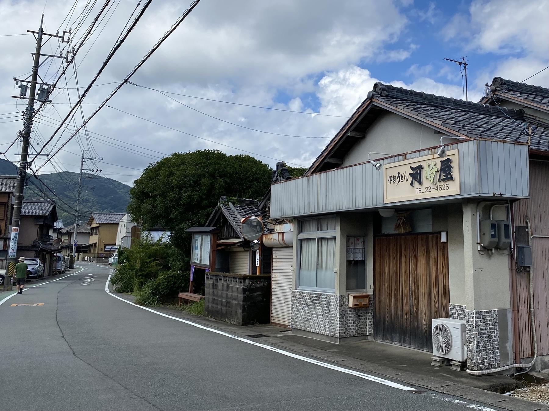 大安旅館の近くには、小津監督が立ち寄ったうどん屋がありました。昭和37年12月7日、小津監督が58歳の時に中学時代の友人へ宛てた手紙です。「古市に来て大安泊、早速河崎屋のうどんをくふ。」寄宿舎から外出して友人達と食べた伊勢うどんは、後年まで懐かしい味だったのでしょう。残念ながら河崎屋は随分前に廃業し、小津監督が食べたうどんを味わうことはできませんでした。営業当時の河崎屋が紹介されている本によると、創業は大正時代。店内には懐かしい出前岡持ちがズラリと並び、出汁は丁寧に手削りした鰹節で取っていました。こだわりの出汁で作られた伊勢うどんのたれは、コク深い味わいであったそうです。