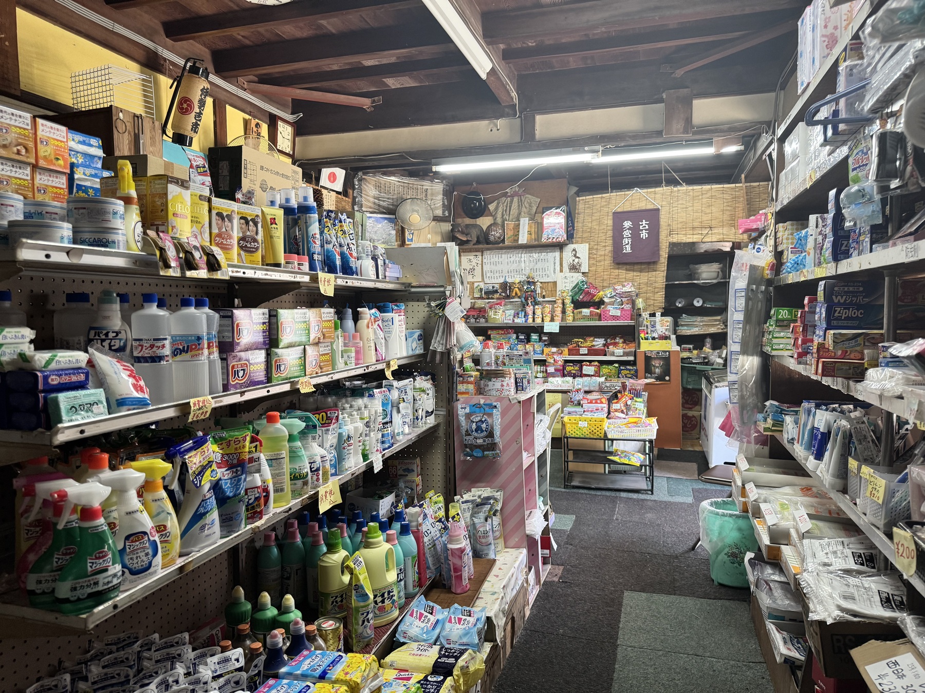 長い長い尾部坂を登り切りほっとひと息。ここからは尾根に沿って平坦な道を歩きます。妓楼や料理屋が軒を連ねた街道沿いにその面影はなく、住宅や商店が並ぶ静かな風景が続いています。しばらく行くと、岳道という脇街道の入口に素敵なお店を見つけました。明治32年創業の判慶商店さんは、駄菓子や日用品を扱う昔ながらのよろず屋さんです。4代目のご主人に古市の歴史などを教えていただきながらしばし休憩。昭和初期に建てられたお店には、ハタキや落とし紙など懐かしい暮らしの道具が並んでいました。