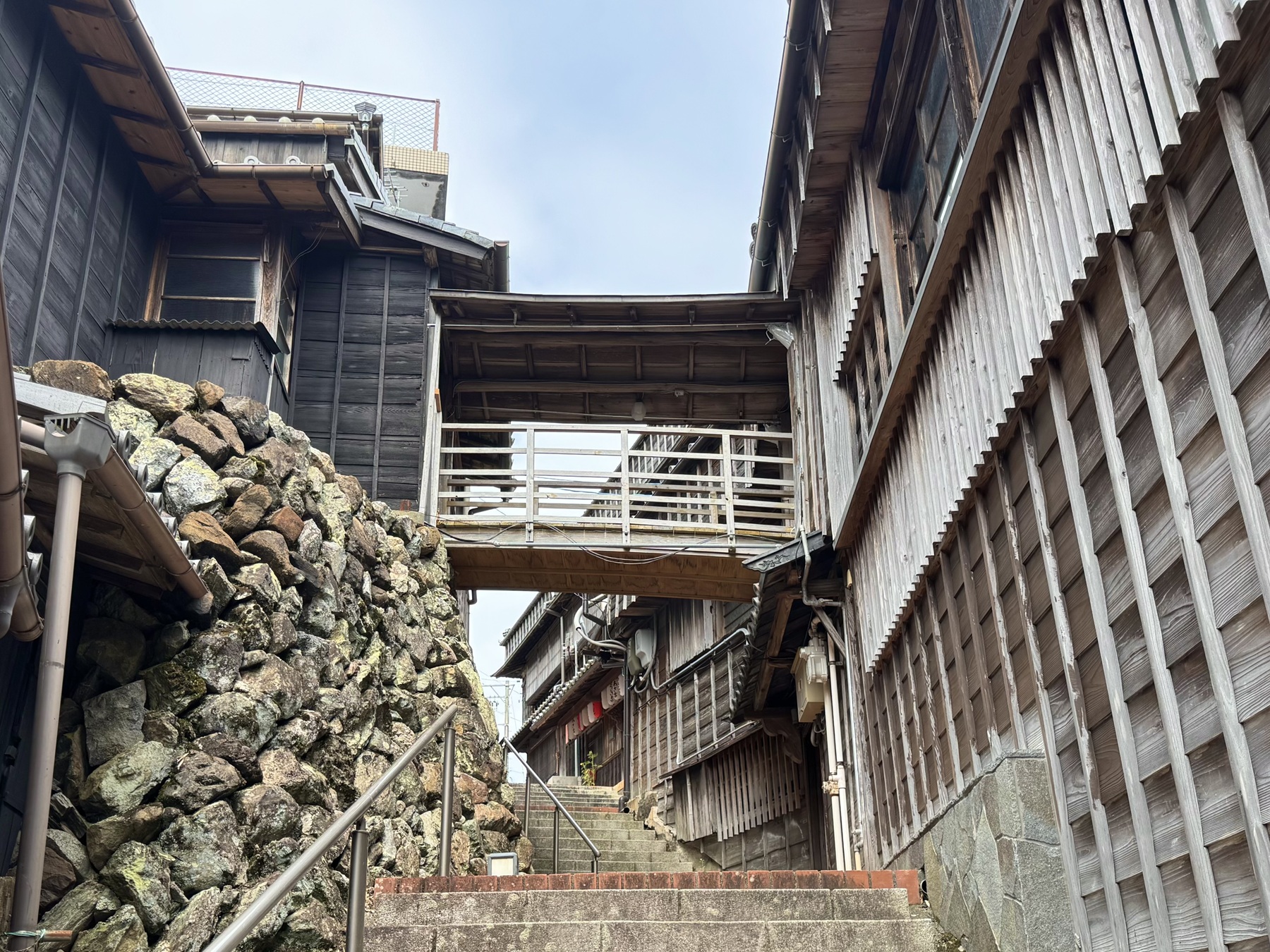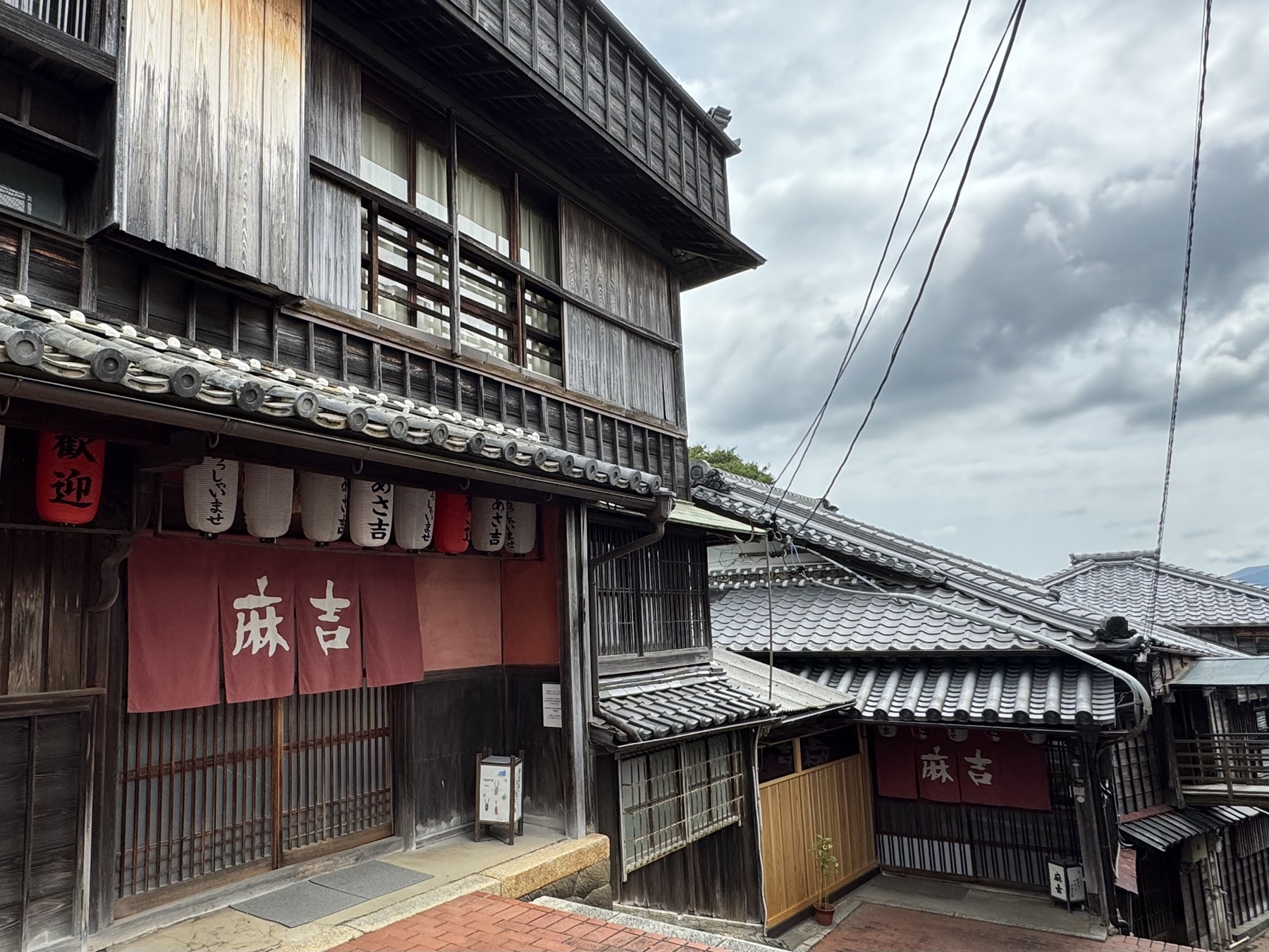 再び古市街道へ。遊女や歌舞伎役者の信仰を集めた長峰神社を過ぎ左手の路地を曲がると、古市の栄華を現在に伝える麻吉旅館の威容が現れます。元は花月楼麻吉という名の茶屋で、最盛期には30人を超える抱え芸妓を擁したといいます。正確な創業年は不明なものの、天明2年の地図に既に麻吉の名があることから、240年を超える歴史を持つ宿です。