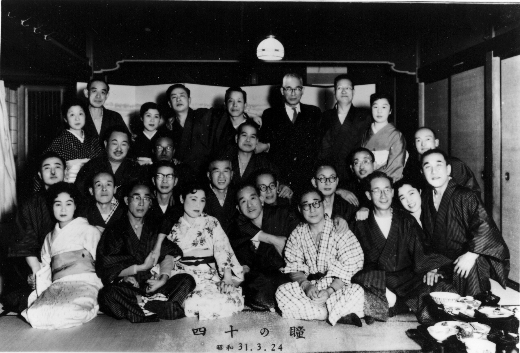 昭和31年3月24日、小津監督が52歳の時に大安旅館で宇治山田中学校の同窓会が行われました。前列中央に座っているのが小津監督です。参加者は総勢20名。小豆島を舞台におなご先生と12人の子供達のふれあいを描いた「二十四の瞳」をもじって、「四十の瞳」とお茶目なキャプションが添えられています。肩を組んだり手を繋いだり、卒業後35年の時を超えて中学生に戻ったような皆さんの様子が微笑ましいです。