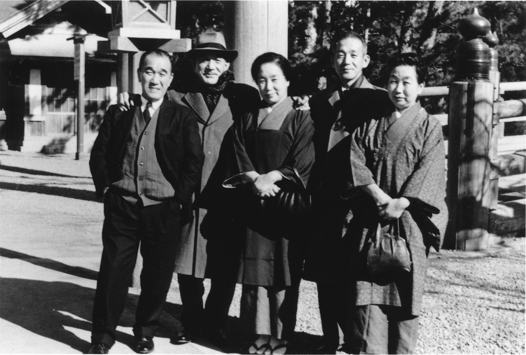 昭和37年12月、小津監督は同年2月に亡くなった母・あさゑさんのお骨を京都の高野山に納め、松阪と伊勢を回る旅をしました。旅の最終日、12月7日に宇治橋前で撮影された小津兄弟と友人の記念写真です。小津監督の傍に立っているのは、中学の帰省の際、松阪の停車場で迎えてくれた妹の登貴さんと登久さんです。笑顔で肩を組む様子から小津兄弟の仲の良さが伝わってきます。