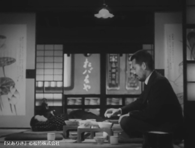 中学校の寄宿舎で暮らす良平が、面会に訪れた父と旅館で食事をするシーン。久しぶりに父と食事ができて嬉しそうな良平の笑顔が印象的です。笠智衆さん演じる父親は、ゆっくりお酒を飲みながら、食事をする息子を優しく見守っています。このシーンで良平はお膳に乗った和食を食べていますが、食事が済んだ後袴を緩めながら