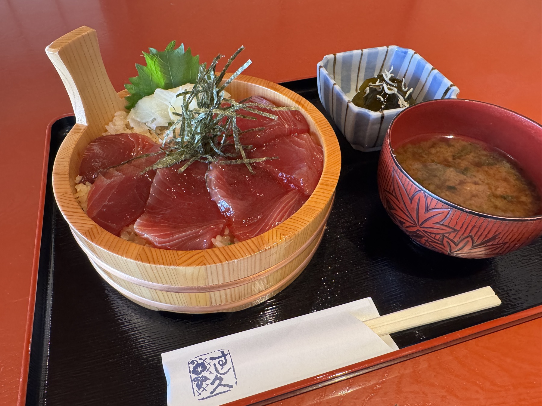 すし久名物のてこね寿しをいただきました。てこね寿しは、漁師が釣り上げた魚を捌いて醤油に漬け、酢飯と混ぜて食べたことから生まれた郷土料理。鰹漁が盛んだった志摩地方で、漁の間に船上で手早く摂れる食事として広まったそうです。ほんのり紅い酢飯の上に、甘辛い醤油だれに漬け込んだ鰹が美しく並びます。厚切りの鰹は全く臭みがなく、甘みのある漬けだれと爽やかな酢飯が魚の旨味をより引き立ててくれます。