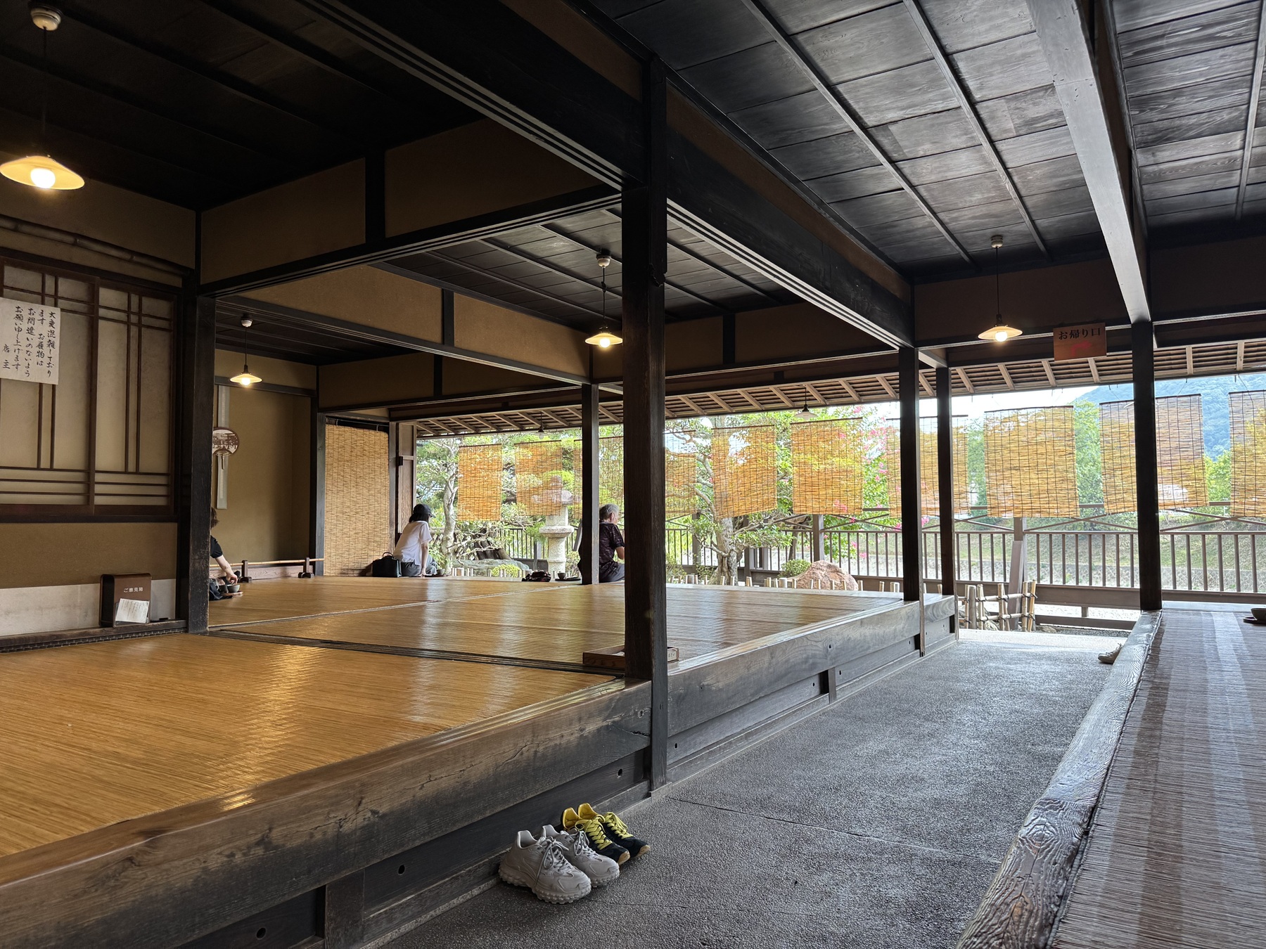 赤福本店の奥には広々とした座敷と縁側があります。五十鈴川を眺めながら、職人さんによる手作りの赤福餅をいただくことができますよ。赤福の餡に付けられた三本の筋は五十鈴川の清流を表したもの。店内では職人さん達が餅を餡で包み、指先で一つ一つ三筋の流れを形どっています。