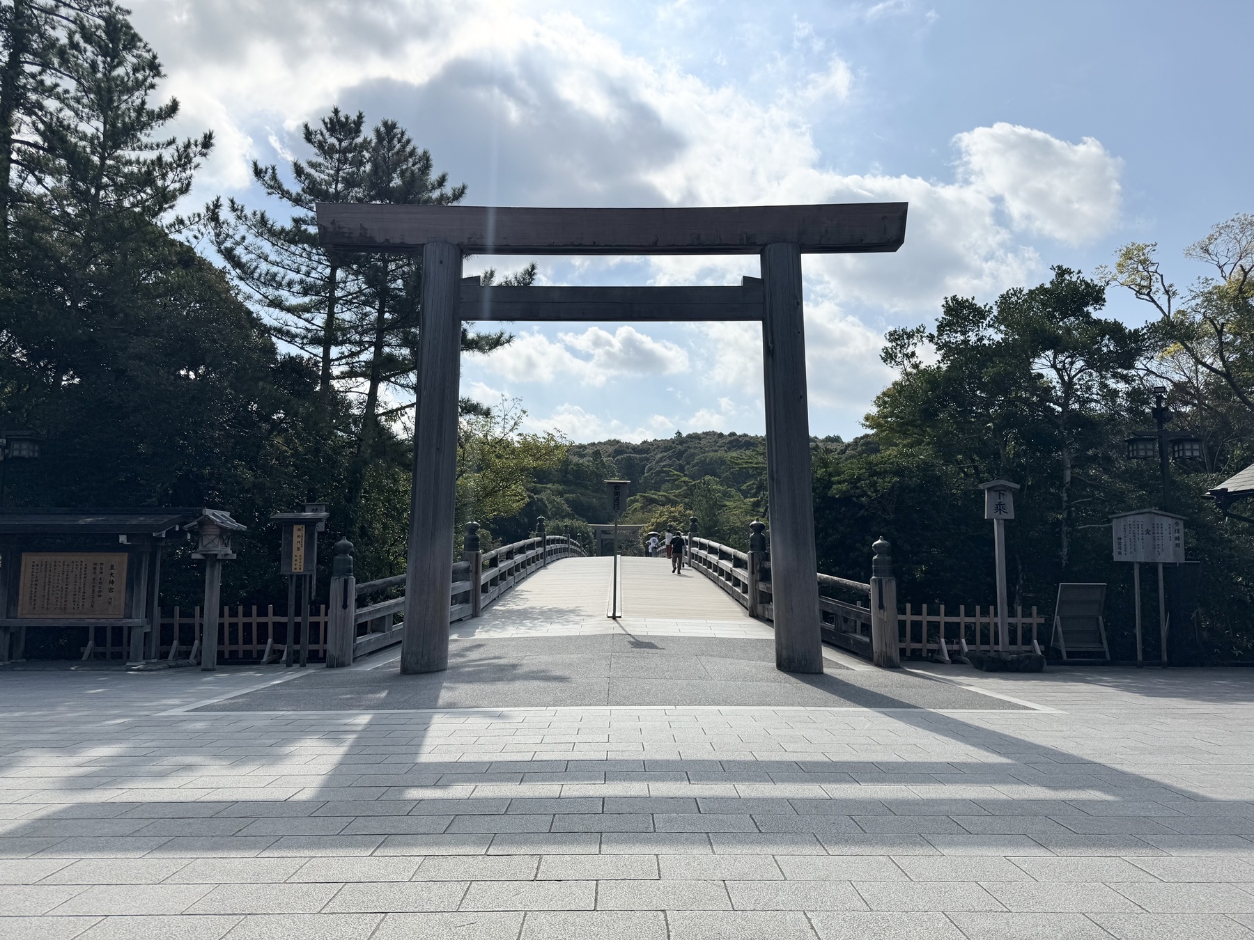 おはらい町を抜けると宇治橋前の大鳥居が見えてきます。内宮の神域へは鳥居を潜り、五十鈴川に掛かる宇治橋を渡ります。