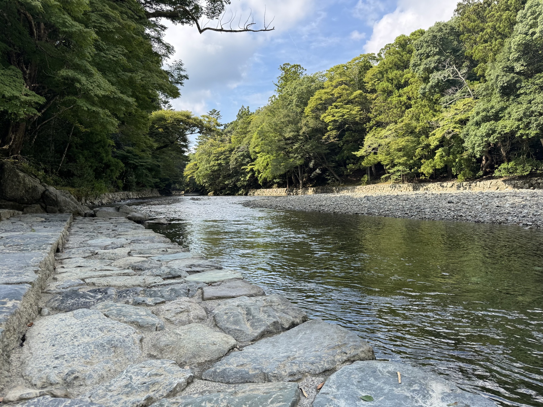 内宮の神域を流れる五十鈴川。いにしえの旅人達は参拝前に清流で禊をし、心身を清めたといいます。