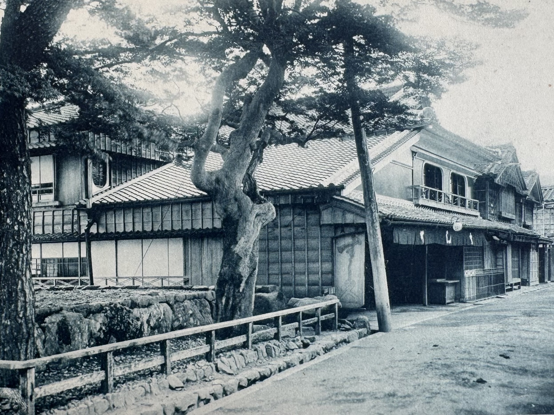 すし久は天保年間に寿司屋として創業し、その後五十鈴川で獲れる鮎などを供する料理旅館となりました。明治から昭和にかけては内宮前屈指の料理旅館として、勅使の宿泊所に指定されていたといいます。写真は明治時代から大正初期にかけて撮影されたすし久旅館。伝統的な切妻造りでありながら、黒と白に塗り分けられた壁のデザインから、とてもモダンな印象を受けます。