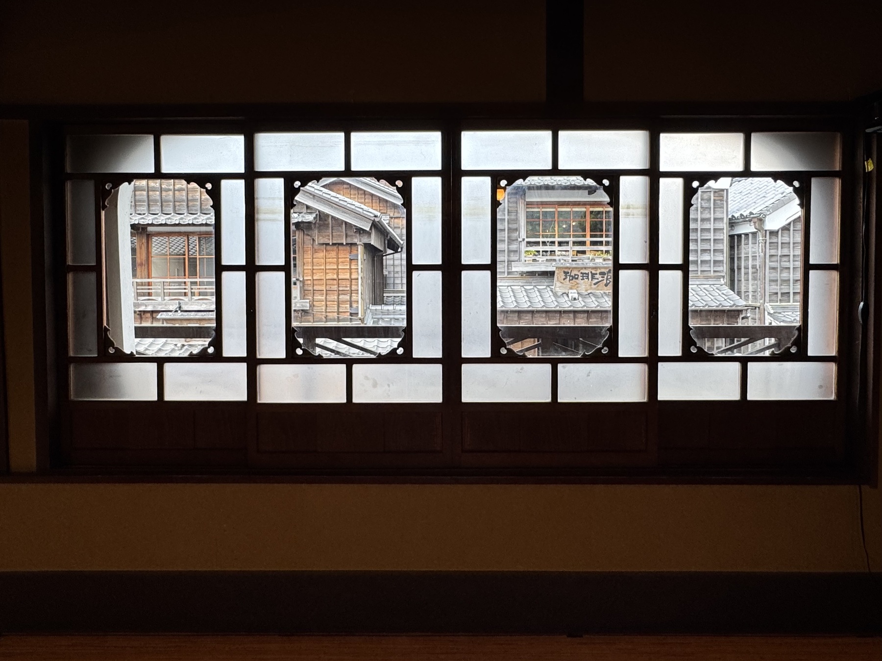 2階のお部屋へ案内していただきました。まずは川に面したお部屋へ。窓の外には五十鈴川の清流と朝熊山の峰々が広がり、四季の情景とともに食事を楽しむことができます。次に賑やかなおはらい町に面したお部屋に入った瞬間ハッとしました。窓の向こうには、通りに軒を連ねる店々の壁が並んでいます。