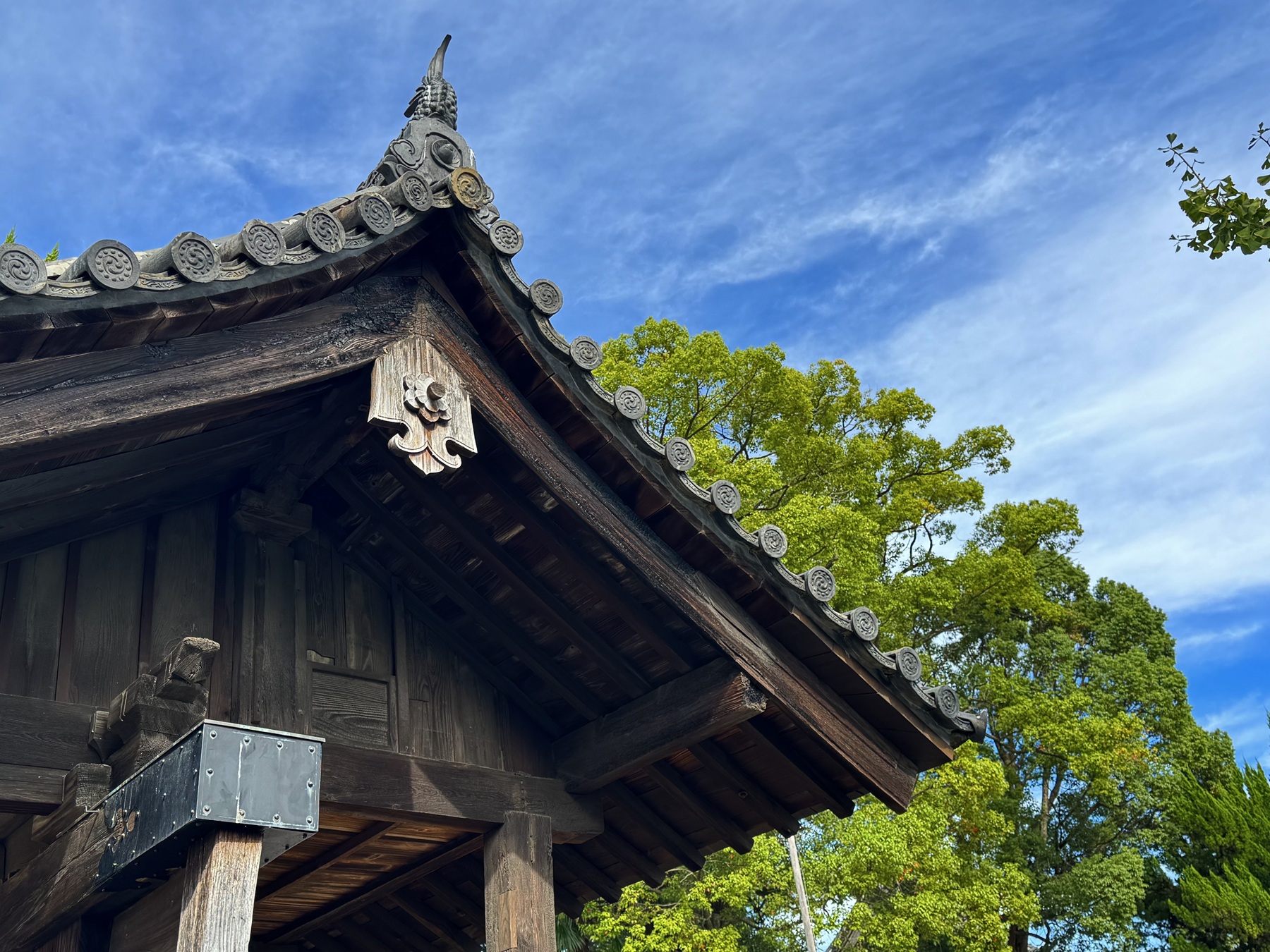 龍泉寺の三門は安土桃山時代の様式を示す貴重な建築物として、県指定有形文化財となっています。側面の破風には、昭和26年の松阪大火で黒く焼け焦げた跡が残り、炎の激しさを伝えています。先々代の御住職が門の上から懸命に水をかけ、燃え盛る門前から命懸けで寺への類焼を食い止めたそうです。現在は区画整理によって龍泉寺の隣に国道が通り、景観が大きく変わっています。神楽座があった当時の面影はありませんが、松阪にお越しの際はぜひ龍泉寺を訪れ、小津監督の夢と青春が詰まった神楽座に思いを馳せてみてください。
