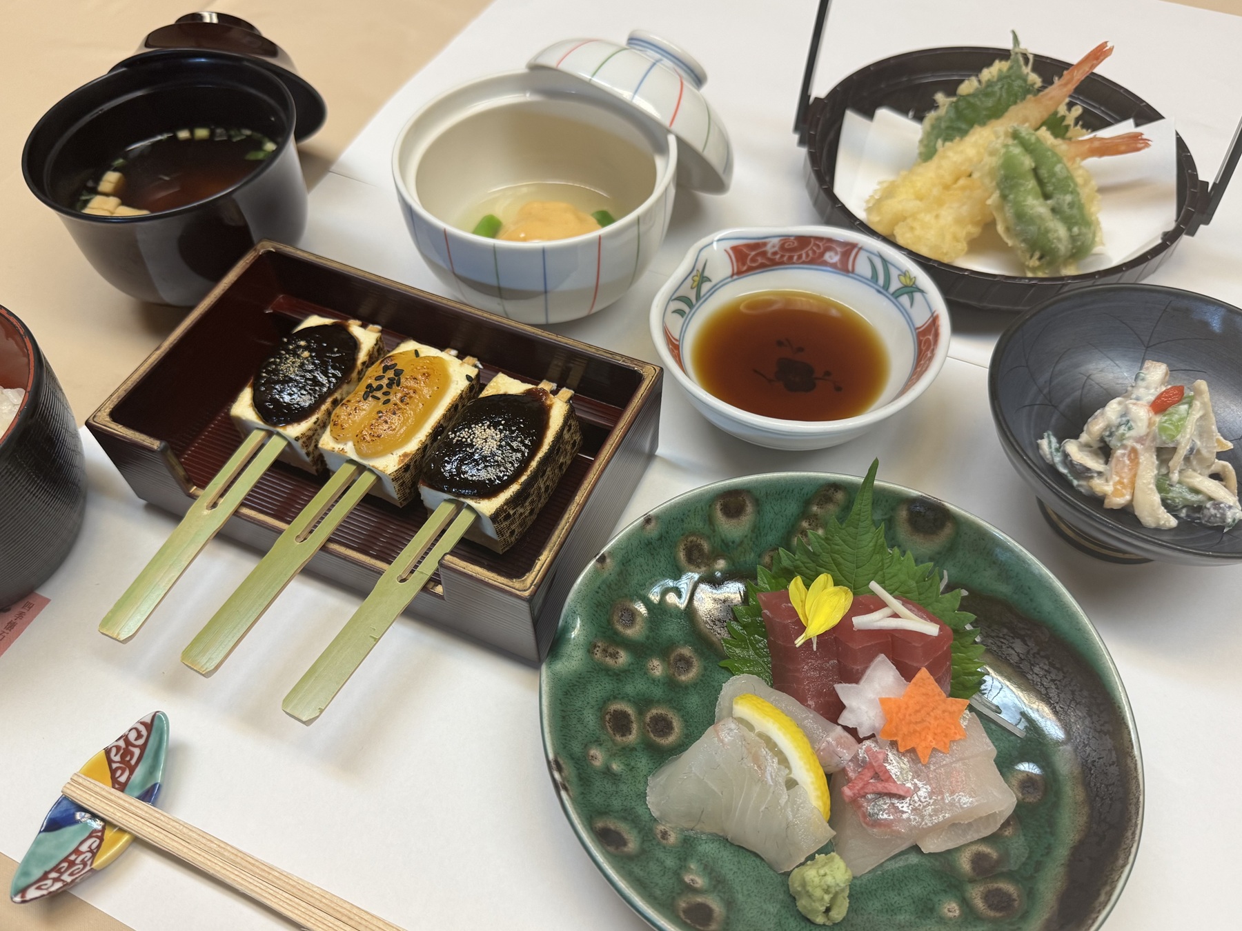私は冷奴、田楽、湯豆腐の中から、田楽をお願いしました。濃厚な甘味噌に山椒がピリッと効いています。これからの季節は熱々の湯豆腐もいいですね!秋らしい柿やきのこの白和えは、上品な和え衣が柿の甘みを引き立て、とても美味しかったです。