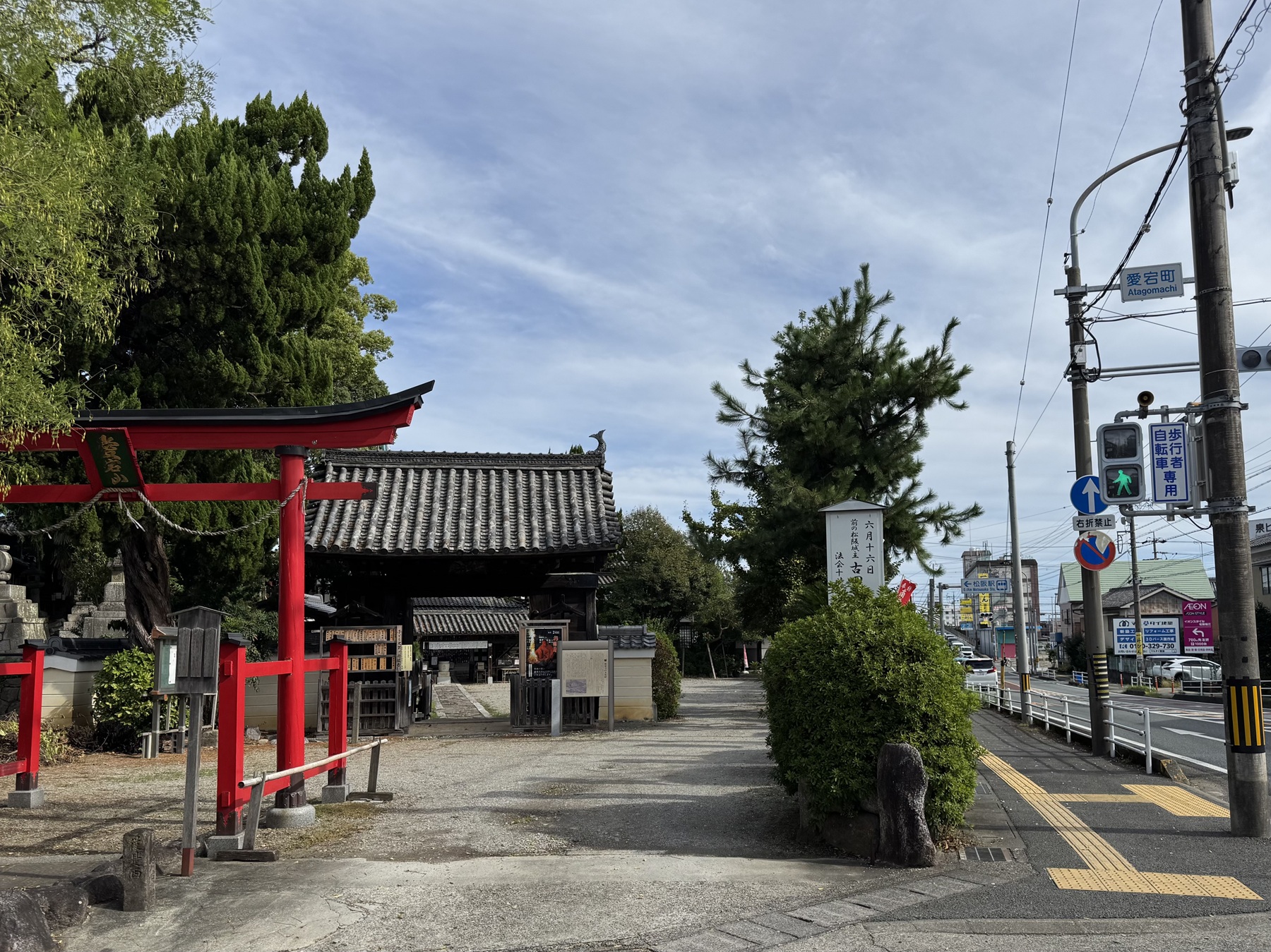 集会所がある交差点を右折すると、愛宕山龍泉寺の三門が見えます。龍泉寺は奈良時代に聖武天皇の勅命により建立され、戦国武将蒲生氏郷が松坂城を築城した際、現在の地に移建されました。古くから「あたごさん」の名で親しまれ、火防や良縁にご利益があるお寺として信仰を集めています。龍泉寺の門前には、小津監督が足繁く通った映画館「神楽座」がありました。