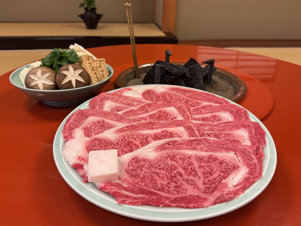 美しい輪島塗の円卓で、小津監督が愛した和田金の「寿き焼(すき焼き)」をいただきました。和田金で供される牛肉は、兵庫県産の黒毛和種の中から優秀な雌の仔牛を厳選し、自社牧場で丹念に肥育された松阪牛です。