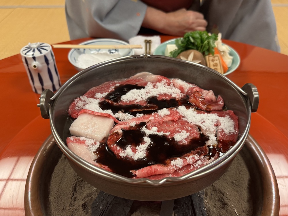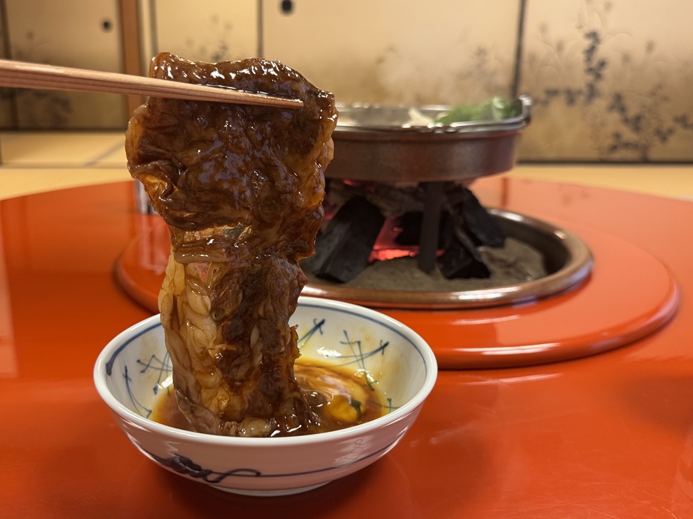 樫の木で作られた上質な菊炭の上に、南部鉄の鉄鍋が据えられます。味付けはお砂糖とたまり醤油と少量の昆布出汁。柔らかな炭火でお肉にゆっくりと火を通します。