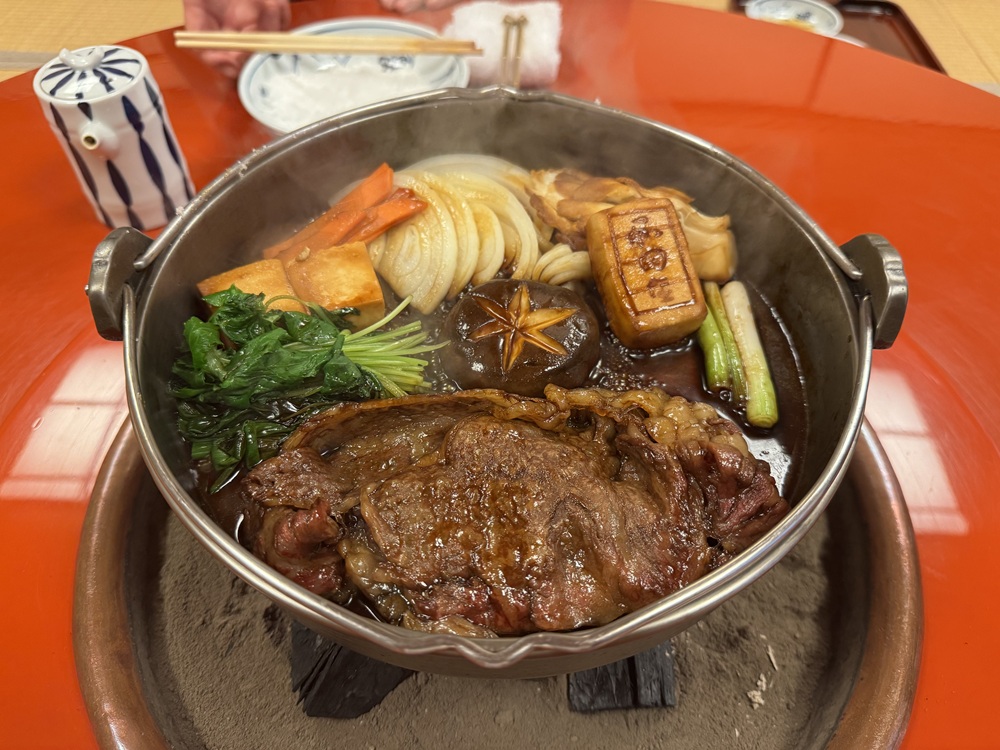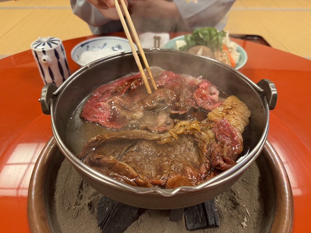 次に野菜を入れた寿き焼を仕立ててもらいます。淡路島産の玉ねぎや大分県産の椎茸など、こだわりの具材が鍋に並びます。出来上がりを待つ間も仲居さんの鮮やかな手つきから目が離せません。お鍋に溶けた牛脂とお肉の旨みが野菜に移り、こちらもたまらない美味しさでした。
