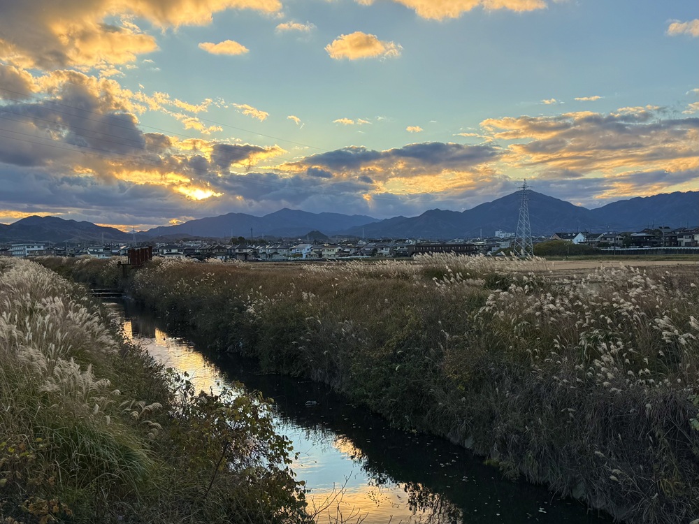 OZU活松阪編の最後に夕暮れの金剛川を訪れました。空一面を赤く染める夕陽と川岸を覆う銀色の芒。17歳の小津監督が眺めた金剛川の冬茜はその場を去り難くなる美しさでした。