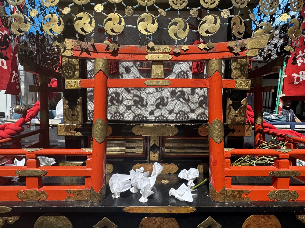 神輿の3面には丸い神鏡が吊られ、赤い小さな鳥居が据えられています。煌びやかな金色の簾は、なるほど丸い硬貨が繋がっている様に見えますね。祭の見物客が投げた賽銭が簾に引っかかっていたのでしょう。神輿に向かって白い紙に包まれた賽銭が次々と投げられ、沿道は大変な賑やかさだったことが想像できます。