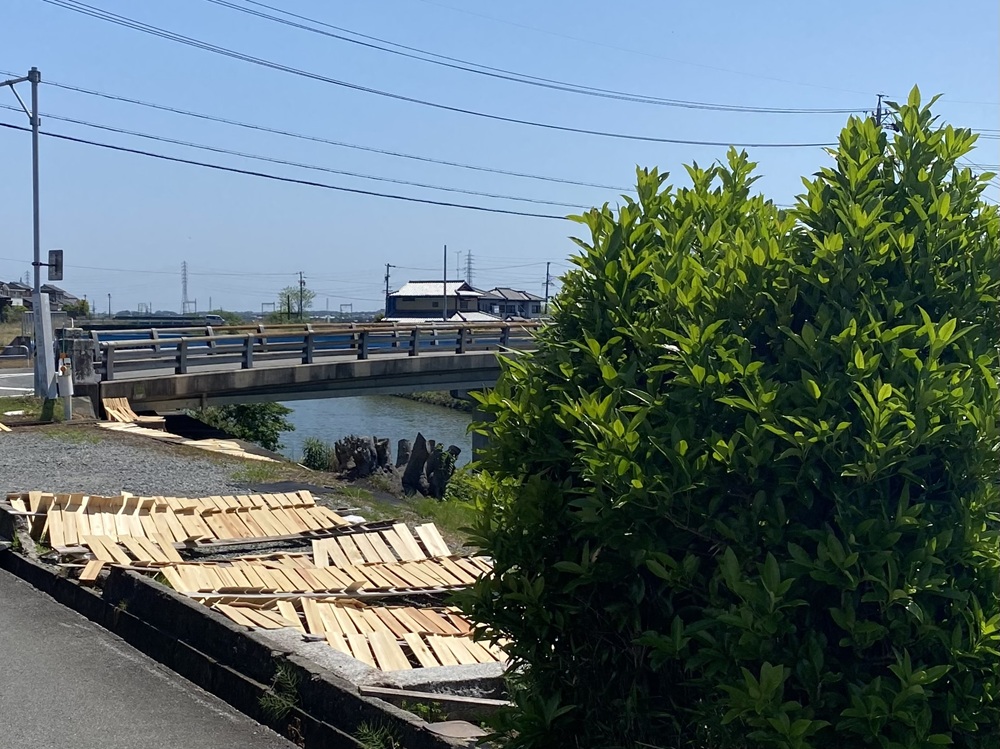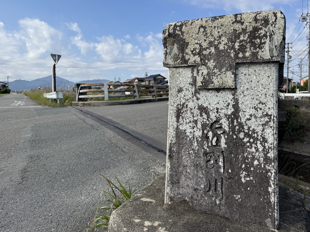 金剛川の川岸からは松阪郊外に連なる山々が一望できます。一際美しい三角形の山影は標高757mの堀坂山(ほっさかさん)です。