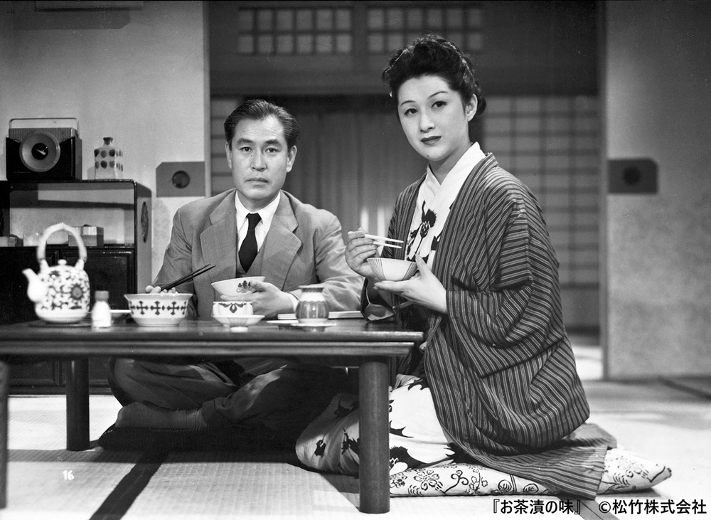 昭和27年公開の『お茶漬の味』は、結婚以来心の通い合いがなかった夫婦が、夫の海外出張を機に絆を深めるストーリーです。夫の茂吉を佐分利信さん、妻の妙子を小暮実千代さんが演じました。旅立ちの日の深夜、飛行機が故障して思いがけず茂吉が帰宅します。差し向かいでお茶漬を食べながら、妙子は初めて素直な心で茂吉と向き合います。台所でお茶漬を用意しながら、2人の心が徐々に重なっていく様子には静かな感動を覚えます。