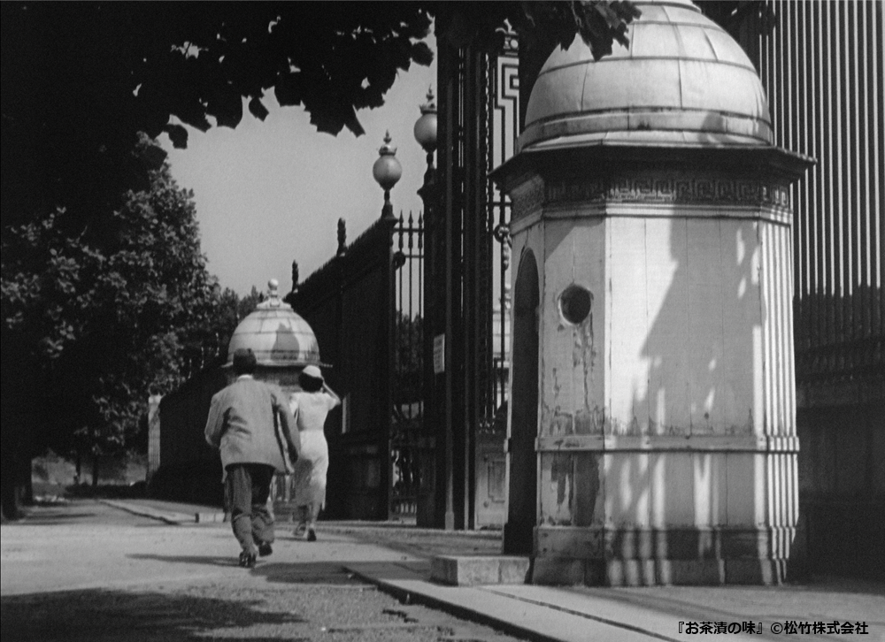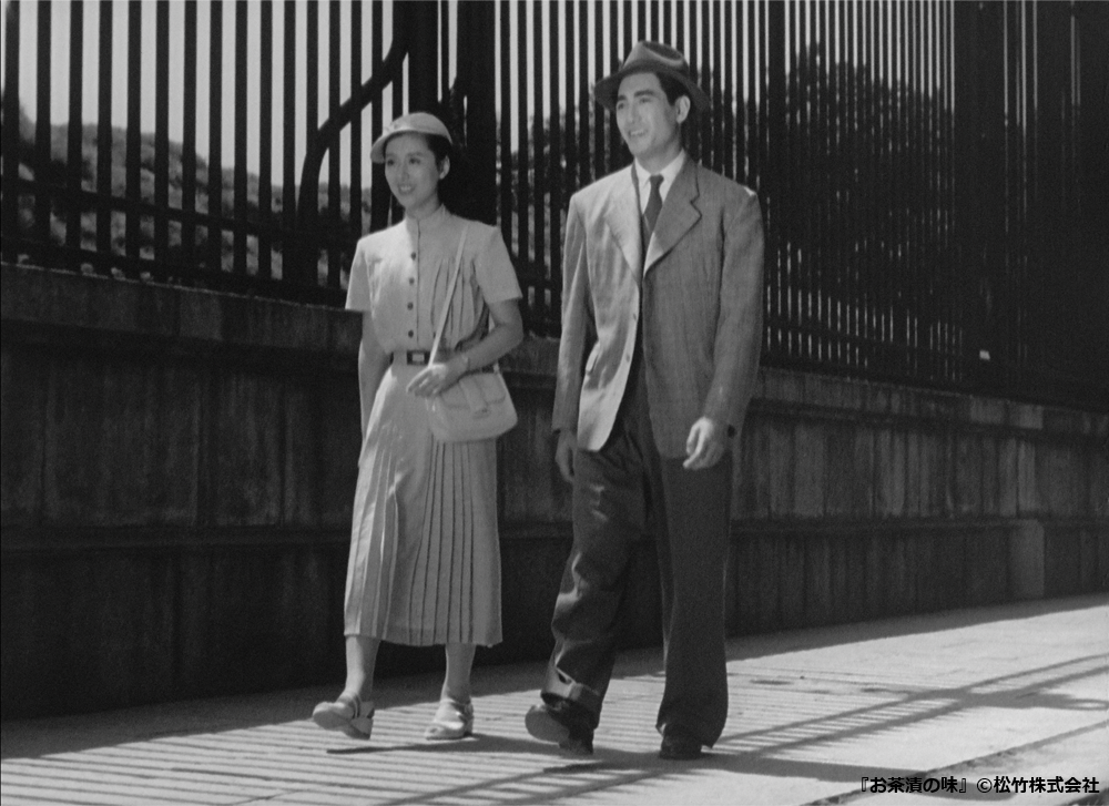『お茶漬の味』に登場する茂吉の親友の弟・ノンちゃんと、妙子の姪・節子さん。演じる鶴田浩二さんと津島恵子さんが歩くのは赤坂離宮前の歩道です。
