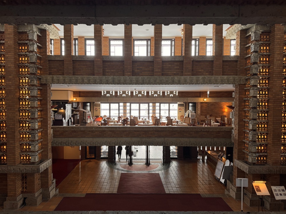 彫刻を施した大谷石やスクラッチレンガ、透しテラコッタなど多彩な幾何学模様がロビーを装飾し、吹き抜けを貫く「光の龍柱」からは、テラコッタを透かして温かい光が溢れていました。3階の窓からは柔らかい自然光がロビーに降り注ぎ、浮かび上がる陰影は影絵のような美しさです。