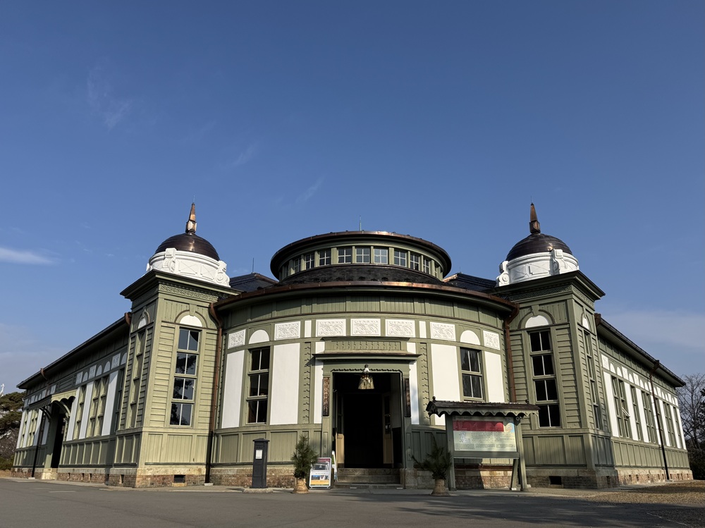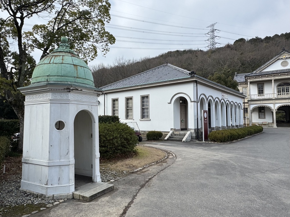 まずは明治村4丁目46番地にある「宇治山田郵便局舎」を訪れました。円形の中央棟の両脇に角塔が配置された、優美なシンメトリーのデザインが特徴的です。鮮やかな緑色の外壁は明治42年の創業当時に塗られた色に復しています。