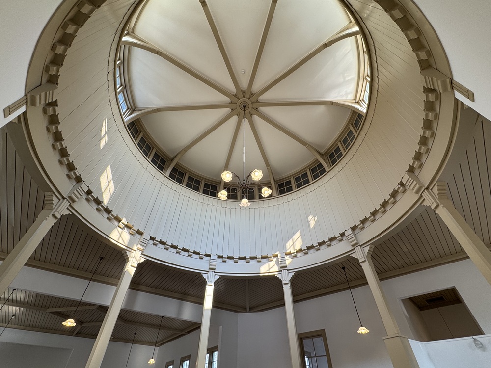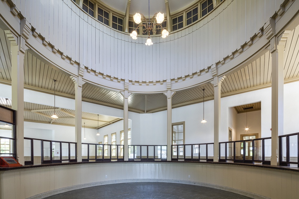 中央棟の正面入口を入ると「公衆室」と呼ばれる円形ホールがあります。ドーム状の天井には彩光用の高窓が設けられ、局舎内に優しい自然光が降り注ぎます。放射状に敷かれた床石を進むと、公衆室の外周に沿って手続き用の窓口や私書箱が並んでいます。