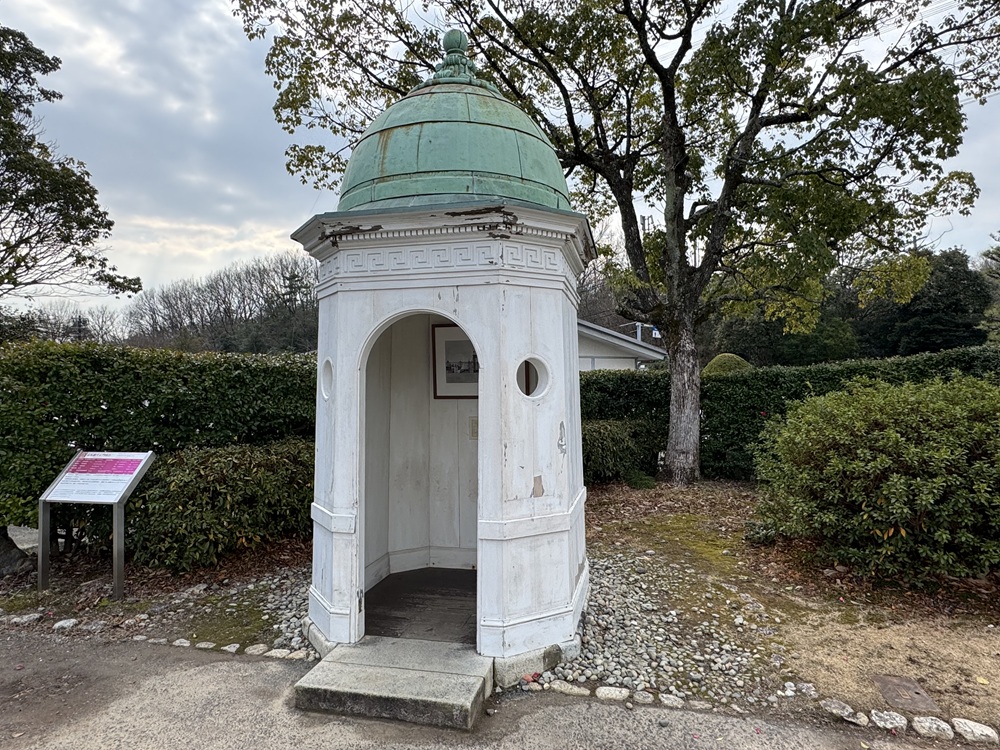 赤坂離宮正門の内外には、警備のために4基の哨舎が設置されました。明治村にはその内の1基が移築されています。八角形の哨舎にはアーチ型の出入口と丸い小窓が設けられています。装飾をのせた銅板葺きの丸屋根は、ネオ・バロック様式の赤坂離宮と調和する洗練されたデザインとなっています。