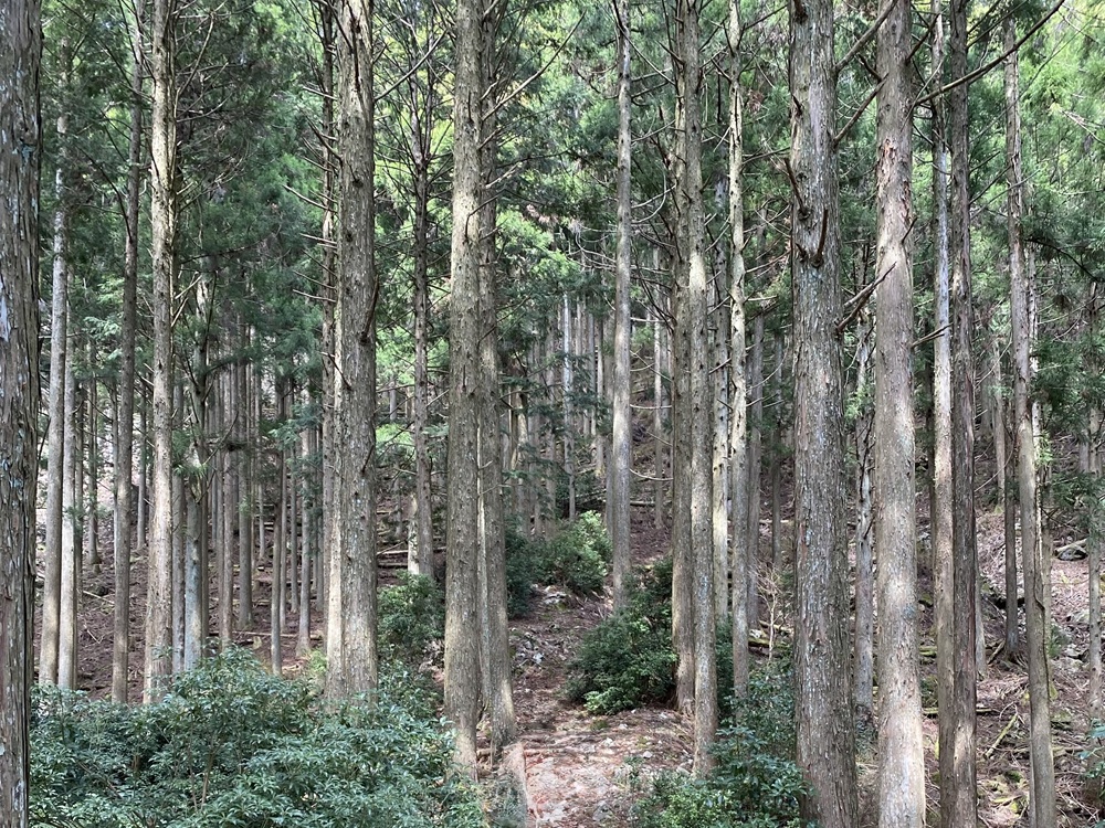 登山口から頂上までは大人の足で2時間程。オーヅ先生が登った旧登山道を辿ってみたくて、私も岳さん登山に挑戦しました。見上げる程の急斜面に九十九折りの山道が続きます。木々に遮られてはいますが、視界が開けた箇所から切れ落ちた斜面を見下ろした時は、恐ろしくて足がすくみそうになりました。