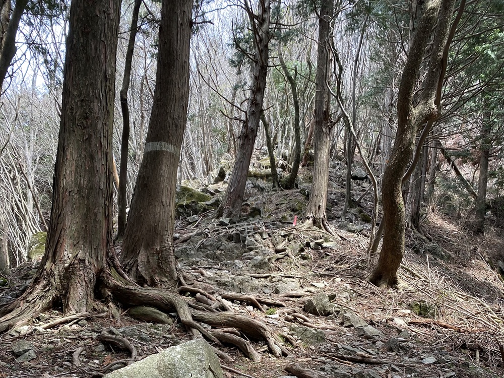 長い斜面を登り切って尾根に出ると、頂上まではあと一息。槍のように尖った頂上へ続く尾根道は更に険しい急登が続きます。剥き出しになった岩や木の根が登山道に張り出している箇所もあり、両手で木の根に掴まってよじ登りました。