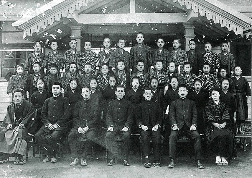 オーヅ先生が子供達と過ごした1年が過ぎ、大正12年3月26日、宮前尋常高等小学校の卒業式が行われました。高等科2年の卒業生と教員の記念写真には、絣の着物にセルの袴、大きな下駄を履いたオーヅ先生が写っています。