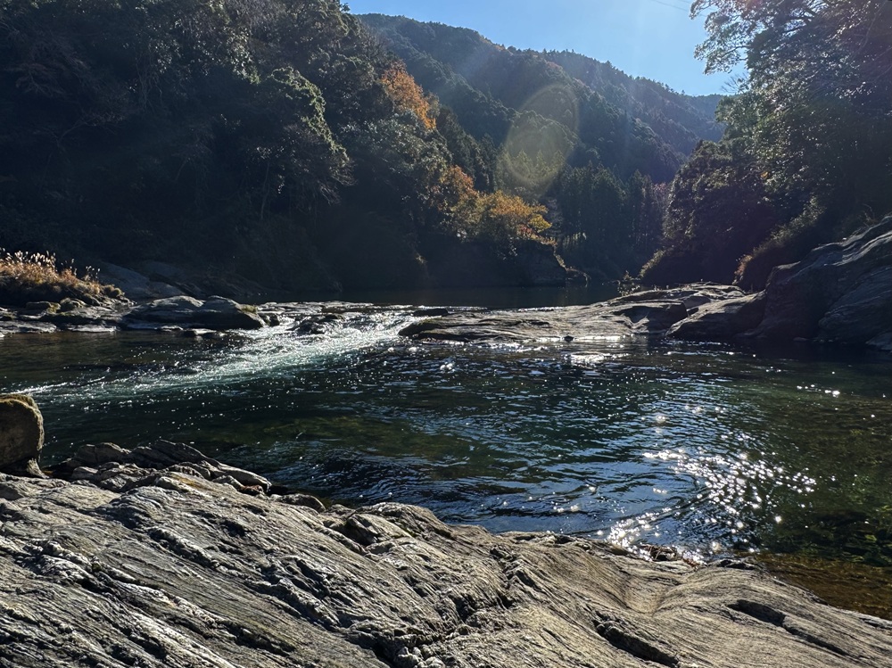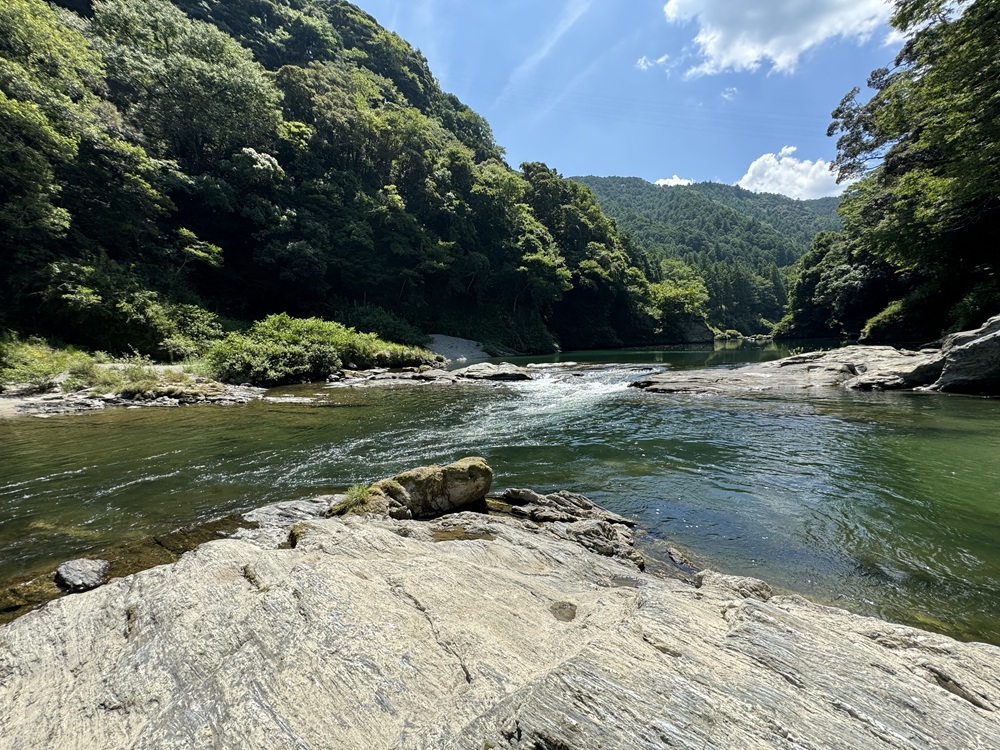吊り橋跡の下流には「大淵」と呼ばれる場所があります。深い緑色の水をたたえた大淵は櫛田川の中で一番深いと云われ、鬱蒼とした大樹が川面を覆うように茂っていました。夏休み前に、オーヅ先生と生徒達は大淵の少し下流にある浅瀬で川遊びを楽しみました。浅瀬のそばには甲羅干しにピッタリの平たい大岩があり、オーヅ先生は岩の上から子供達の様子をじっと見守っていたといいます。