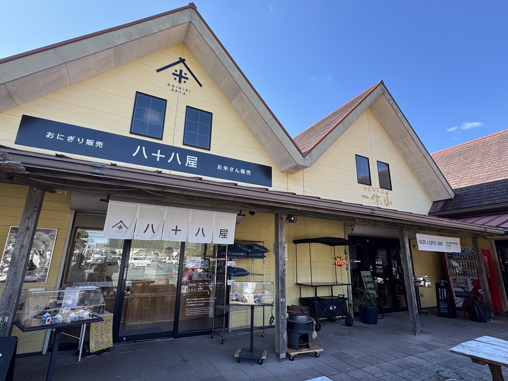 散策の前にお昼ごはんを調達しました。道の駅 飯高駅に隣接する商業施設「香肌横丁」には、個性豊かなグルメのお店が軒を連ねます。地元の米農場が営むお米とおにぎりの店「八十八屋」は、山からの綺麗な水で育まれたこだわりのお米と、注文を受けてから握る出来立てのおにぎりが評判です。自家製の松阪牛しぐれや、飯高名産のとっとき焼きねぎ地味噌など、ご当地ならではの具材が選べるのも大きな魅力です。