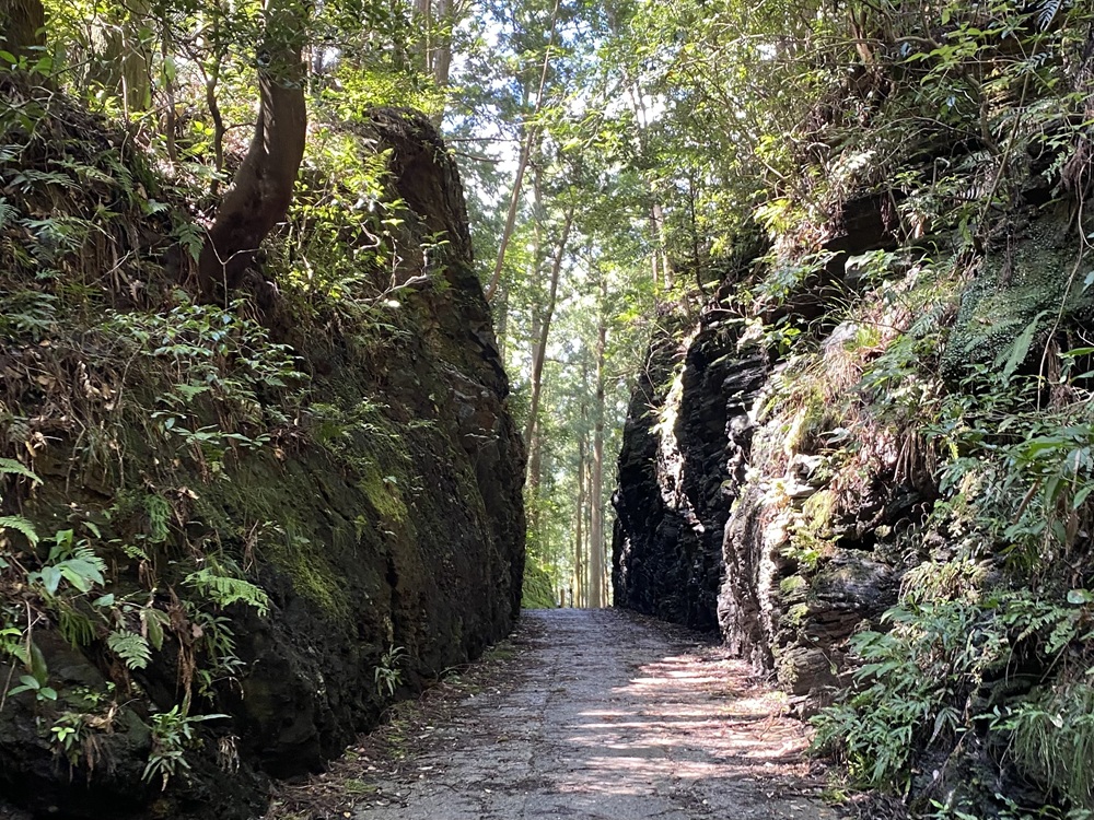 松阪と紀州を結ぶ和歌山街道は、宮前の宿場町を抜けると山の中へと続いていきます。風格漂う古道は、赤桶(あこう)地区に住む子供達の通学路でもありました。赤桶分校に通う子供達は、5年生になると毎朝4kmの山道を歩いて本校まで通学しました。街道の途中にある珍布峠(めずらしとうげ)には、巨大な岩を切り崩した見事な切り通しが残ります。