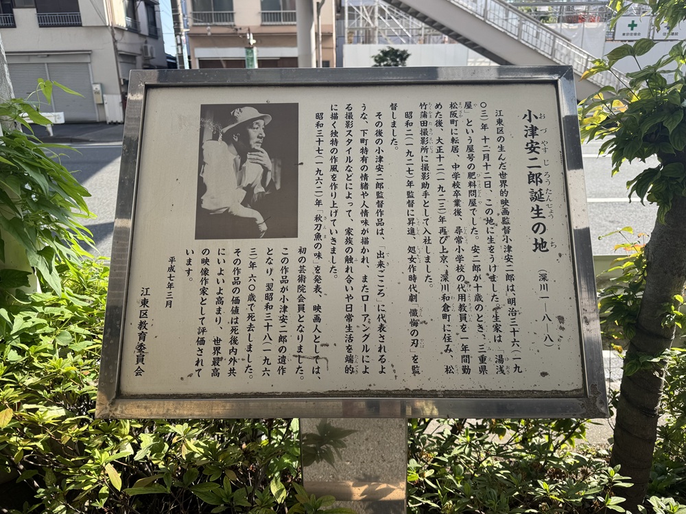 明治38年、2歳の時に同じ町内の亀住町7番地へ転居します。地下鉄門前仲町駅から清澄通りを北上すると、「清澄通り深川一丁目」の歩道橋脇に「小津安二郎生誕の地」の記念プレートがあります。現在は大きなマンションが建つ歩道橋脇の角地が、かつて小津監督が暮らした亀住町7番地でした。