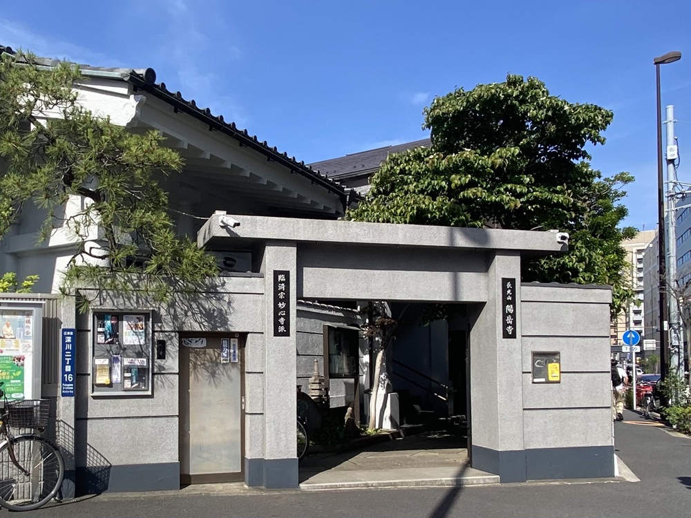 清澄通り「深川1丁目」の交差点には、小津新七家の菩提寺「陽岳寺」が静かに佇んでいます。陽岳寺は寛永14年(1637)に開山された禅宗のお寺です。開山に際しては徳川幕府の船手頭を務めた向井忠勝が多大な支援を行いました。向井氏は船手頭の筆頭であり、忠勝の子孫は代々船手頭の役目を世襲しました。向井氏の菩提寺である陽岳寺は、水辺の街として栄えた深川の歴史を今に伝えてくれます。