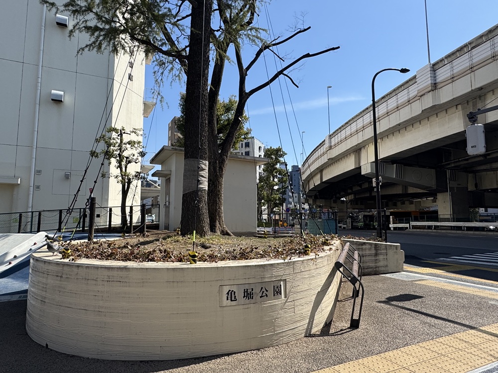 湯浅屋の横を流れていた和泉堀川は埋め立てられ、遊具や遊歩道が整備された「亀堀公園」となっています。公園の細長い敷地だけが、かつてここに川があったことを示しています。和泉堀川に架かっていた「丸太橋」は幼い小津監督の良い遊び場でした。いたずら好きの小津監督は、近所の炭店が丸太橋に干していたタドンをボール代わりに使ってよく叱られたといいます。