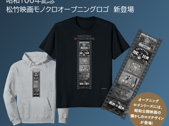 昭和100年記念! 昭和初期、小津安二郎監督、清水宏監督などの作品冒頭を彩った “松竹映画モノクロオープニングロゴ”がTシャツになって登場!