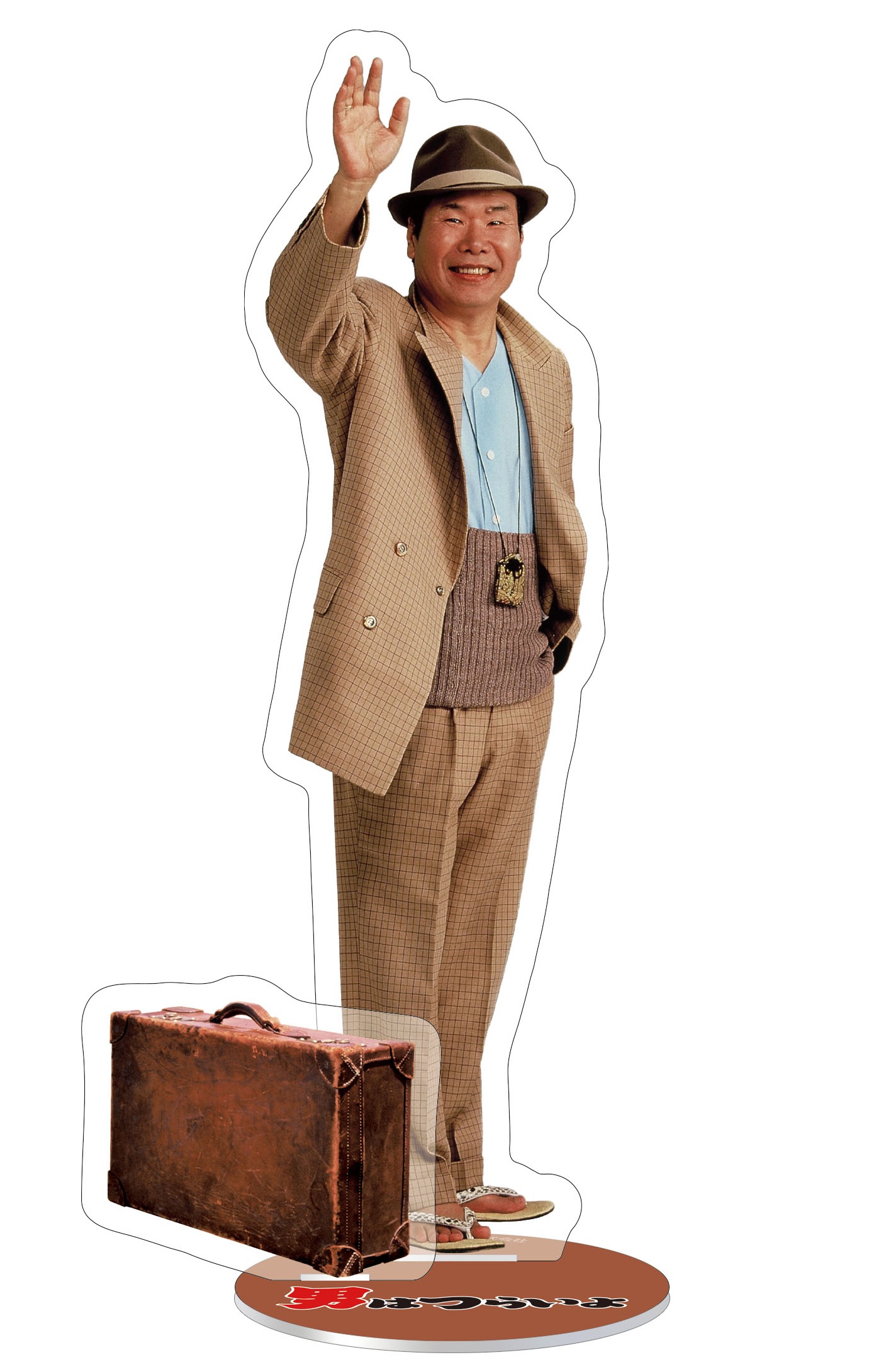 寅さんがにこやかに笑いかけるアクリルスタンドと、これからの寒い季節に実用性もたっぷりの腹巻き。